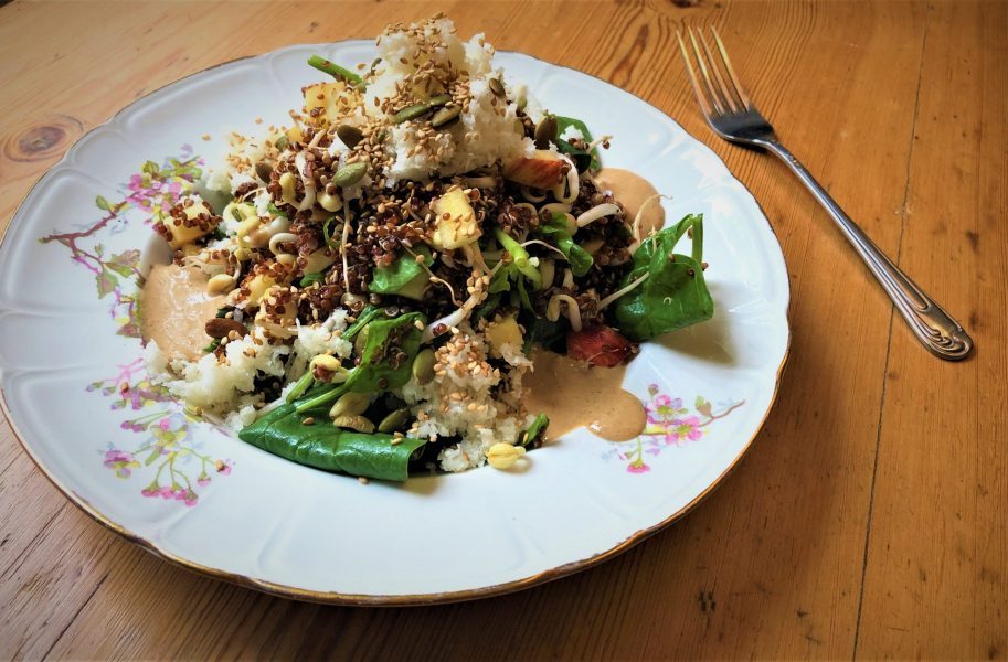 Haricot mungo germé, fleur de chou*, quinoa rouge, pak-choï, sauce tahin-soja, sésame et graines de courge torréfier, jeunes pousses d’épinards, pomme, citron, huile d’olive et de sésame… ça te parle ? *ça sonne mieux que chou-fleur non ? On s’est régalé ! Encore un lunch plein de nutriments et de vitalité ! C’est toujours un plaisir de […]